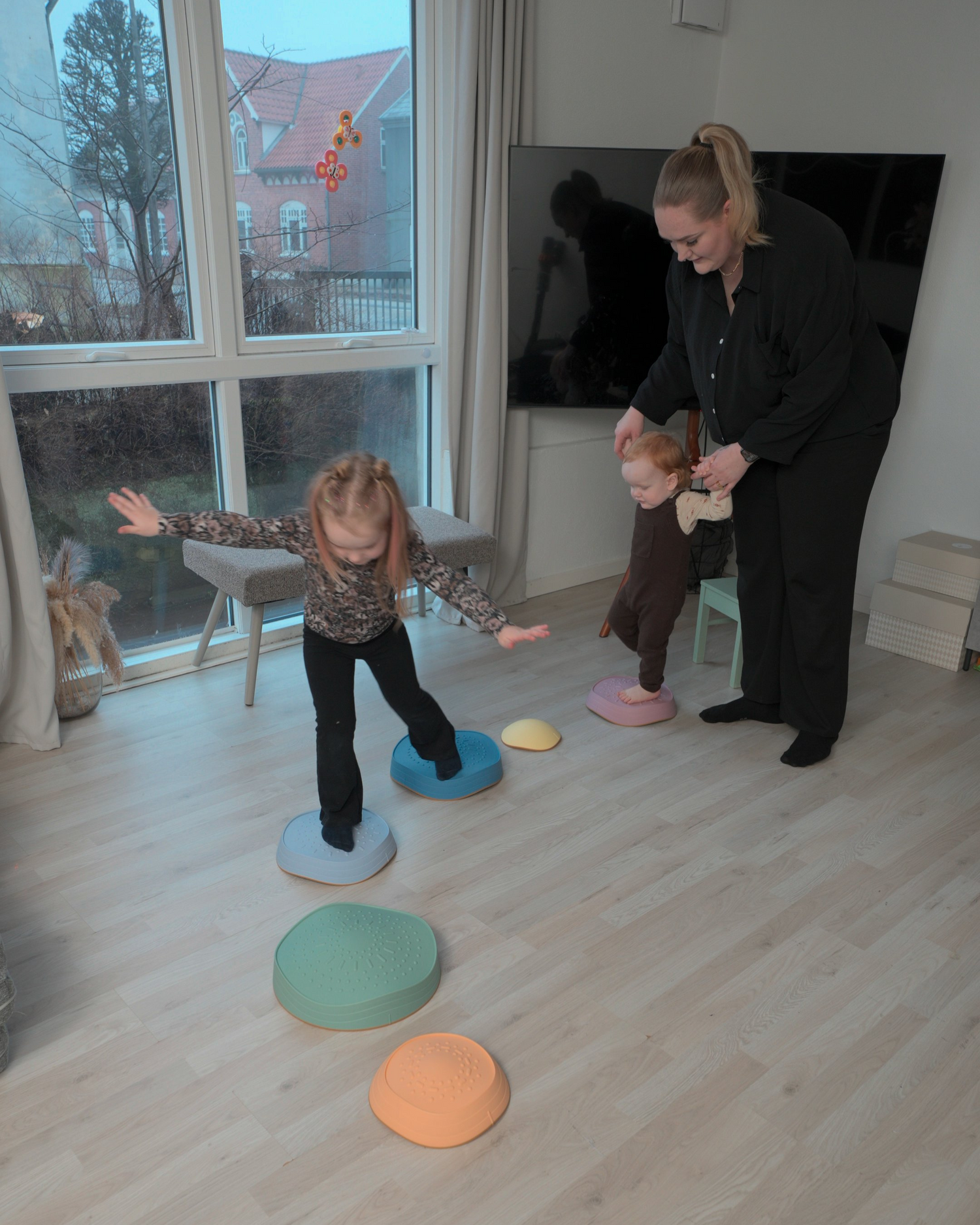 "Taktilsansen, muskel- og leddsansen blir satt i spill når man leker med tumlesteinene. De trener aktivering av de små, leddnære musklene rundt ankel, kne og hofte, som skaper stabilitet."